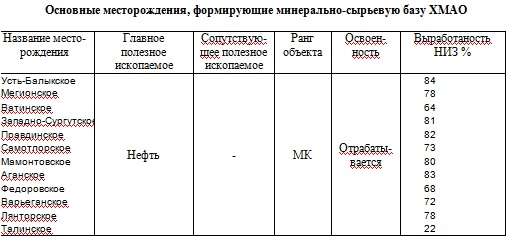 Несмотря на то, что ХМАО является главной базой нефтедобычи в РФ, которая составляет 57%, подготовленная ресурсная база не обеспечивает требуемых уровней добычи. К настоящему моменту гигантские залежи УВ (>3000 млн.т) практически выявлены, крупные залежи (30-3000 млн.т) выявлены на 45%, средние (10-30 млн.т) на 37%, мелкие (<10млн.т) на 15%.